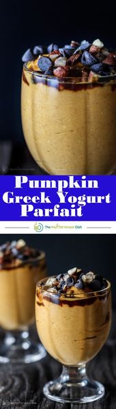 5-Minute Pumpkin Greek Yogurt Parfait | The Mediterranean Dish. Pumpkin puree, Greek yogurt, a little mascarpone with brown sugar, molasses! Top with chocolate chips and your favorite nuts! The perfect gluten-free Thanksgiving treat…but if you ask me, I’ll have this for breakfast any day!