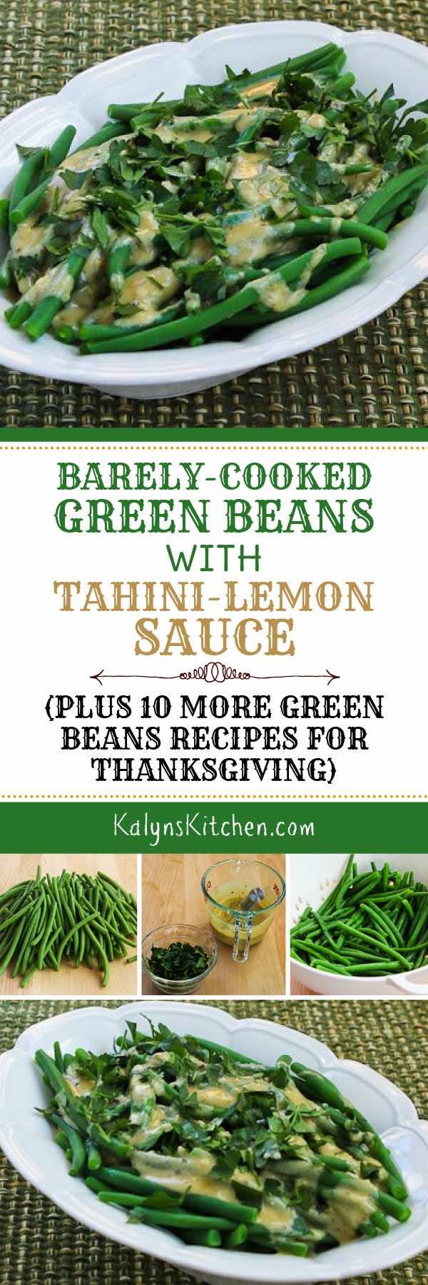 Barely-Cooked Green Beans with Tahini-Lemon Sauce are an amazing side dish for a special meal like Thanksgiving, plus this post has 10 More Green Beans Recipes for Thanksgiving! [found on KalynsKitchen.com] #KalynsKitchen #BarelyCookedGreenBeansTahiniLemonSauce #GreenBeans #GreenBeanSideDish #ThanksgivingSideDish #ThanksgivingGreenBeans