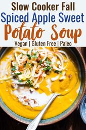 Slow Cooker Creamy Fall Vegan Sweet Potato Soup – this healthy sweet potato soup is made in the slow cooker for an EASY weeknight dinner that is loaded with spicy-sweet, cozy flavor! Gluten free, paleo and SO creamy and delicious! | #Foodfaithfitness | #Paleo #Glutenfree