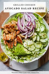 Grilled Chicken Avocado Salad is a great salad for spring and summer! It’s made with chopped lettuce, cucumber, red onions, sliced avocado topped and grilled chicken and dressed with an easy lemon-olive oil dressing. Definitely, this flavourful protein packed salad is a great option for a light lunch or dinner! #primaverakitchen #lowcarb