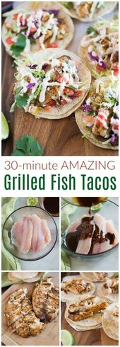 AMAZING and healthy Grilled Fish Tacos loaded with all the best toppings, including cabbage, pico de gallo and a simple homemade white sauce, or “crema”. This easy dinner recipe is can be made in less than 30 minutes! #tacos #fish #grilled