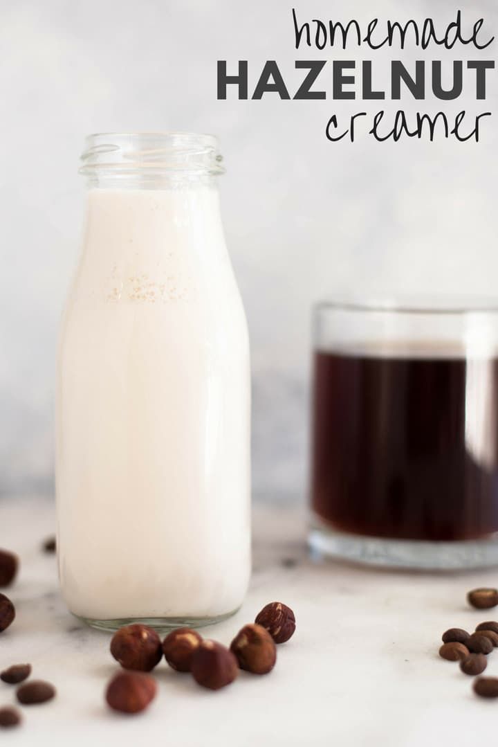 A side image of a bottle filler with healthy Homemade Hazelnut Creamer made with homemade condensed milk, almond milk, pure maple syrup, vanilla extract, arrowroot starch and hazelnut extract. #coffeecreamer #homemadecreamer #asweetpeachef