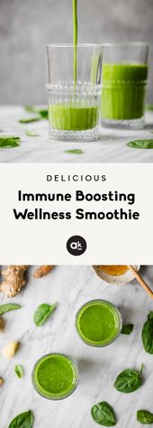 Immune boosting wellness smoothie packed with nourishing ingredients: fresh ginger, turmeric root, spinach, raw or manuka honey, pineapple, banana and black pepper. Great for digestion and a boost for your immune system! #smoothies #greensmoothies #smoothierecipes