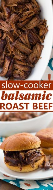 Slow-Cooker Balsamic Roast Beef! Amazingly tender, savory roast beef easily made in the slow-cooker with just 10 min prep. Delicious as pot roast or as a French-dip type sandwich! (Gluten-Free) #glutenfreedinner #glutenfree #roastbeefsandwiches