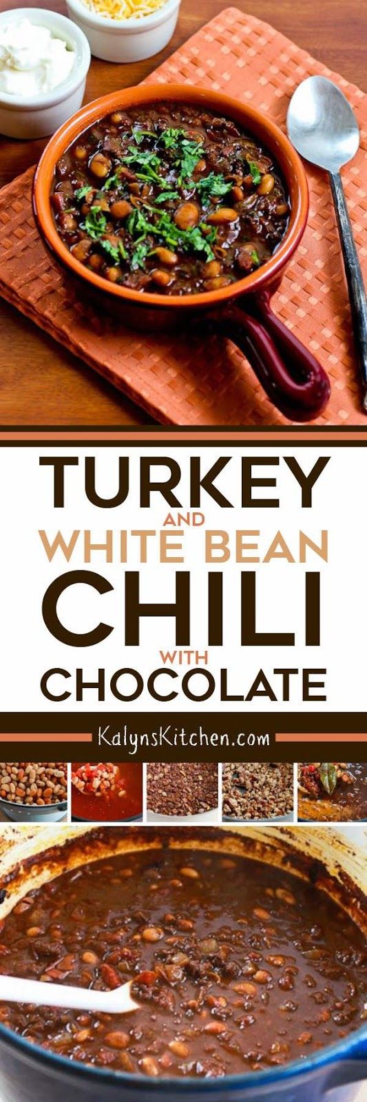 It’s chili season, and this Turkey and White Bean Chili with Chocolate uses ground turkey, white or pinto beans, Ancho chile powder, and just a touch of cocoa powder for a delicious chili recipe that’s gluten-free, dairy-free, low-glycemic, and South Beach Diet friendly. [found on KalynsKitchen.com] #KalynsKitchen #TurkeyChiliRecipe #TurkeyChiliChocolate #TurkeyWhiteBeanChili