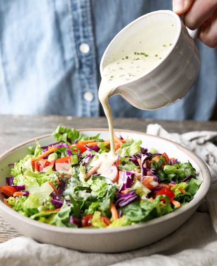 This healthy ranch dressing recipe is dairy-free, vegan, and Paleo-friendly. It gets its creamy texture from cashews and olive oil, and makes a great lower calorie dip or salad topper! #ranchdressing #vegan #paleo #dai