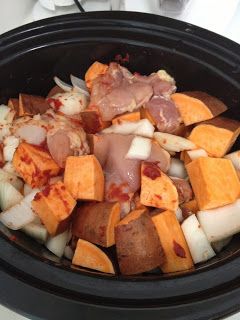 5-Ingredient Slow-Cooker Stew: 2 lbs chicken breast, 2 large sweet potatoes, 1 large onion, 1 Tbs tomato paste + 1 c water, 2-4 cups baby kale (or regular kale, chop into smaller pieces). Cook 1st 4 ingreg. 6 – 8 hrs, stir, add kale for 30 – 60 min.
