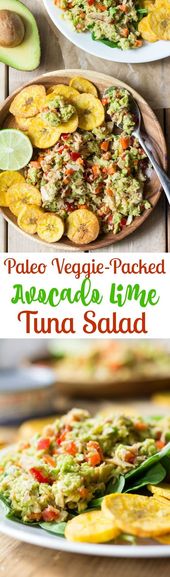 Paleo Veggie Packed Avocado Lime Tuna Salad with plantain chips. A healthy, protein-packed lunch that takes only a couple minutes to make. All clean eating ingredients are used for this healthy salad. Pin now to try later!