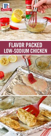 Brush chicken with a homemade mixture of olive oil, lemon juice, crushed rosemary leaves and garlic powder for an easy, low sodium baked chicken recipe. Click through to check out more easy low sodium recipes.