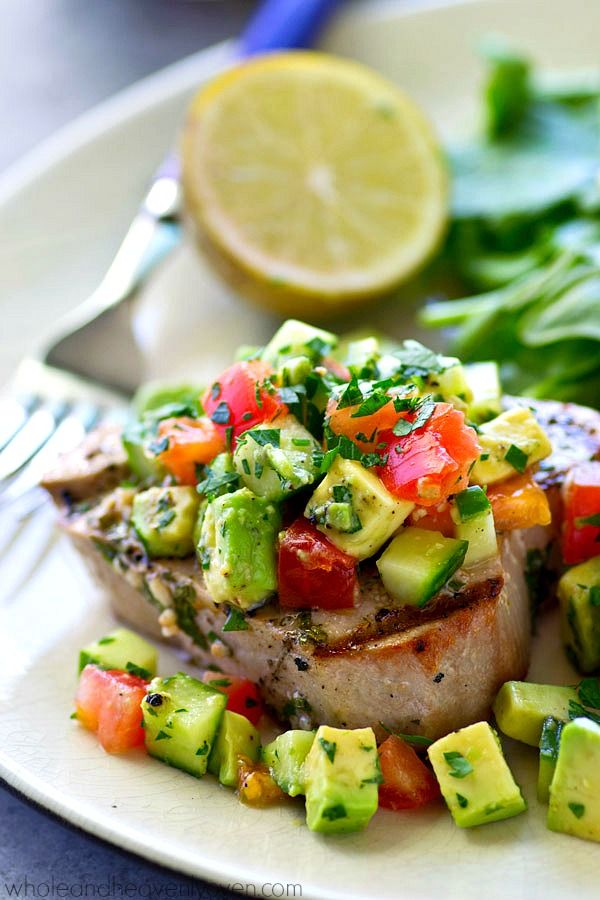 Tender tuna steaks are marinated in cilantro and lots of lime, grilled until perfectly smoky, and topped with an amazing fresh avocado cucumber salsa for one easy summer dinner!