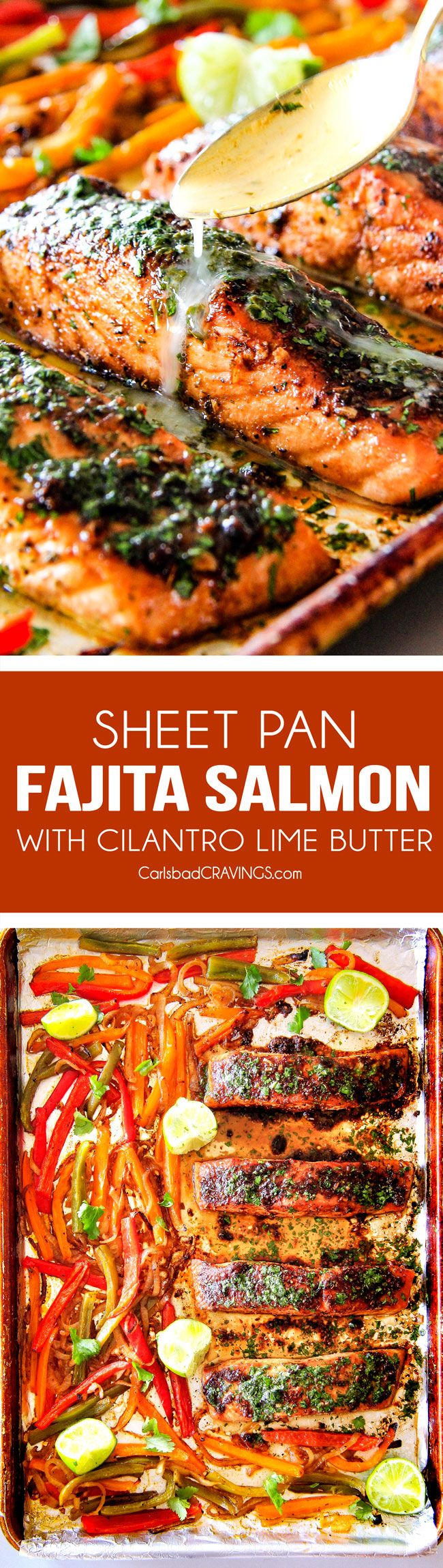Sheet Pan Fajita Salmon with Cilantro Lime Butter – this salmon is the best I’ve ever tried! SO flavorful and juicy and the Cilantro Lime Butter is incredible! I serve this with rice and beans for a complete easy, delicious meal!