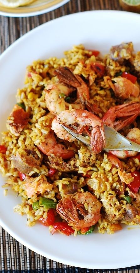 Easy paella with chicken, shrimp and sausage. Spiced up with sweet smoked paprika, chili powder, and just a bit of turmeric for color! You can use orzo pasta or rice. Juicy and bursting with flavors! JuliasAlbum.com