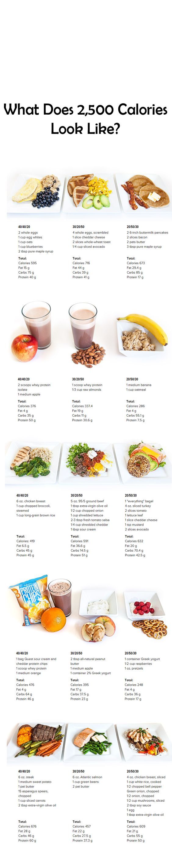 Ever wondered what 2,500 calories looks like? Use this handy visual guide to see a day’s worth of meals across 3 different macronutrient ratios! bodybuilding.7eer…