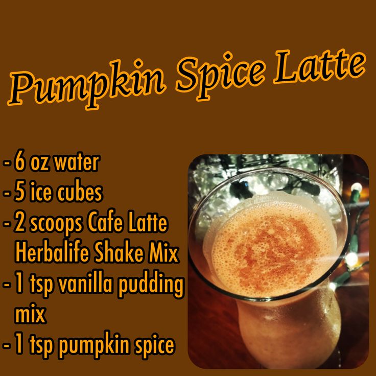 HERBALIFE PUMPKIN SPICE LATTE Ingredients: 6 oz. water (or nonfat milk) 5 ice cubes 2 scoops Herbalife Café Latte Shake Mix 1 tsp vanilla pudding mix 1 tsp pumpkin spice Directions: Place all ingredients in the blender and blend thoroughly until the ice cubes are completely crushed.