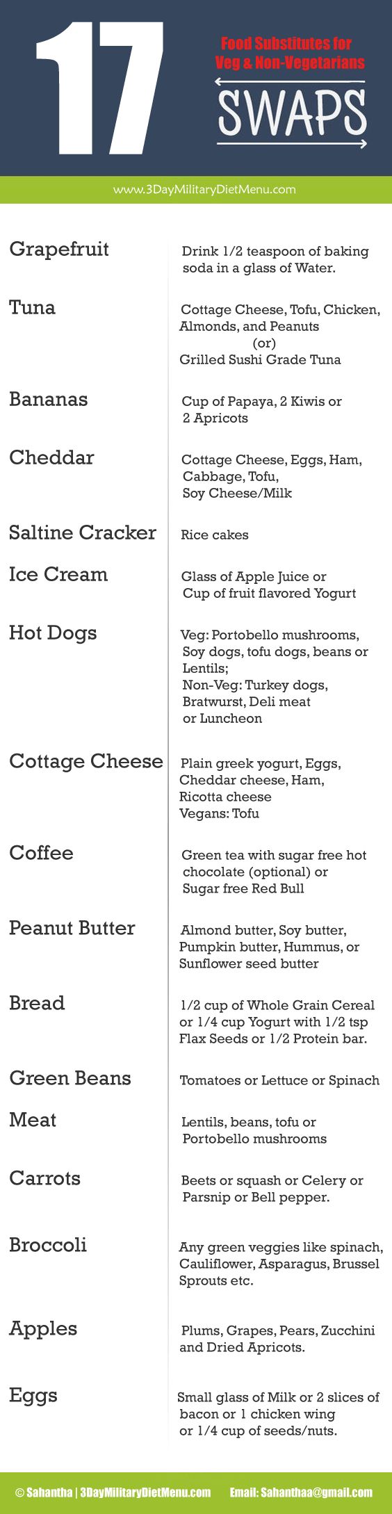 Military Diet Substitutions: Find the list of food substitutes allowed on the 3 day military diet plan.