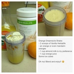 Orange Dreamsicle Shake: • 2 scoops of vanilla herbalife formula 1 shake • 1-2 oranges peeled (or you can even use mandarin oranges but they probably aren’t as healthy, but cheaper) • 1 cup of Vanilla or non flavored almond milk • 1 cup of Orange juice • Some ice cubes