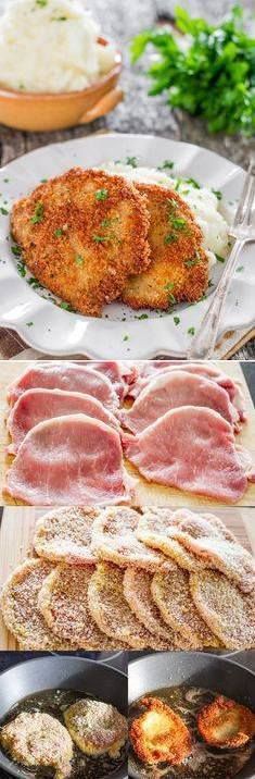 Diet Plans: PORK SCHNITZELS ~ 10 boneless pork chops…2 large eggs…1 c. flour…1 c. Pank… October 8, 2017, 1:27 am 2.2k Views Fast Diet : Illustration Description PORK SCHNITZELS ~ 10 boneless pork chops…2 large eggs…1 c. flour…1 c. Panko crumbs…salt & pepper to taste…vegetable oil for frying 19 shares