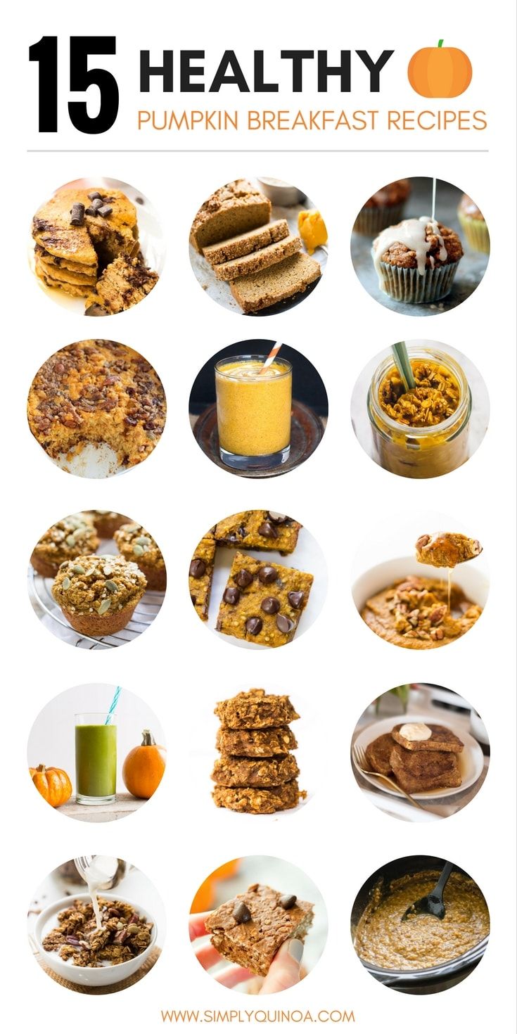 A collection of 15 super healthy pumpkin breakfast recipes! Everything from oatmeal bowls, fluffy pancakes, green smoothies and even healthy pumpkin bread! Hopefully this list gives you lots of inspiration to start your day off on the right foot! Simply Quinoa #simplyquinoa #pumpkin #pumpkinrecipes #breakfast #pumpkinbreakfast #healthypumpkinrecipes #healthybreakfast