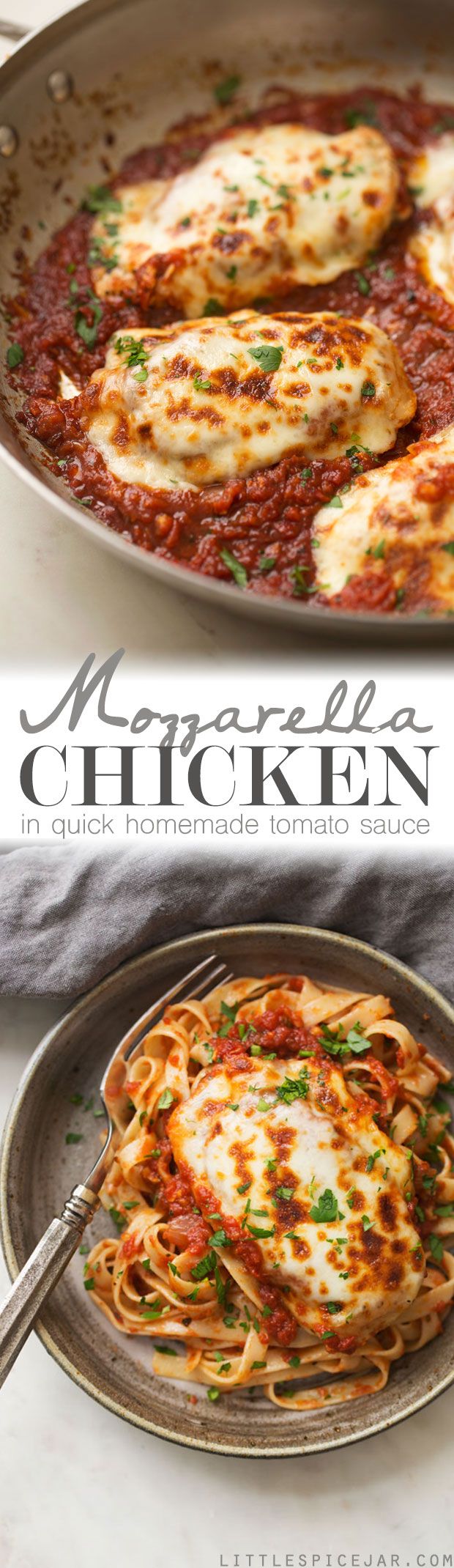 30 Minute Mozzarella Chicken in Tomato Sauce – a quick and easy weeknight recipe for chicken smothered in tomato sauce with melty mozzarella! Serve with bread or pasta! #chickenmozzarella #chickenintomatosauce #mozzarellachicken #30minutemeals | Littlespicejar.com