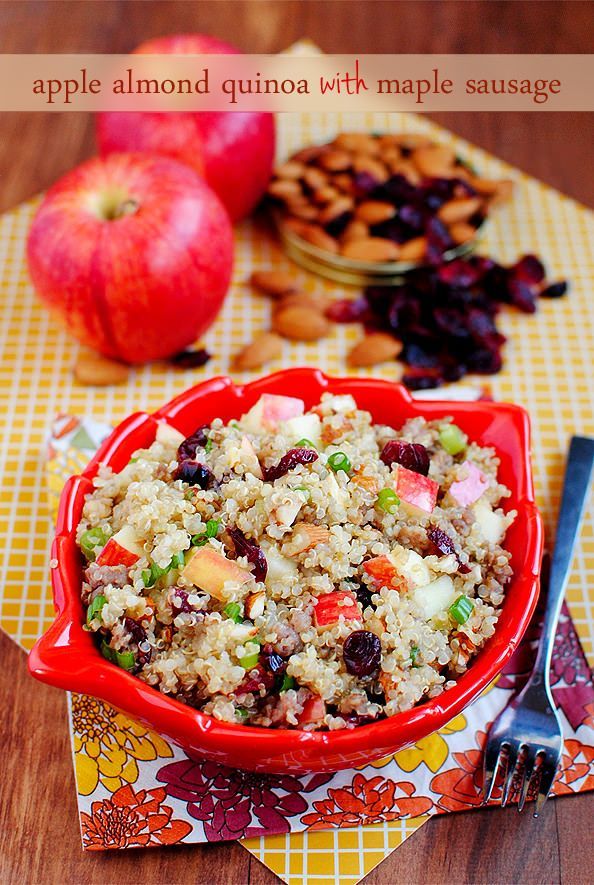 Apple Almond Quinoa with Maple Sausage is the perfect side dish, light lunch, or dinner recipe. Packed with sweet and savory fall flavors! | iowagirleats.com #glutenfree