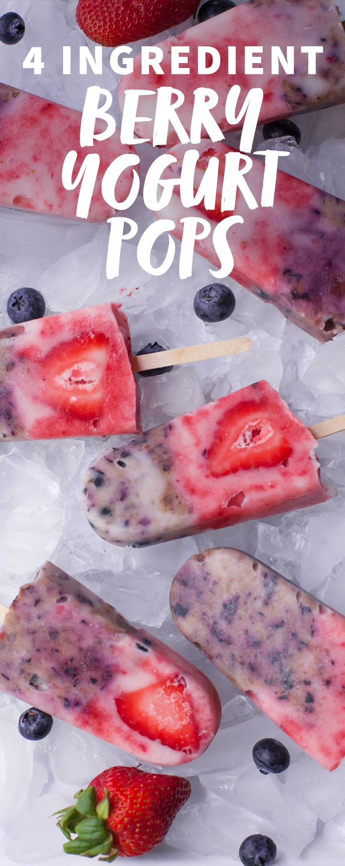 Berry Yogurt Pops: The only ingredients to these healthy pops are yogurt, honey, fruit and lemon juice. You could (and should) eat these popsicles for breakfast! A perfect dessert or cold treat for the summer 4th of July BBQ!! – Wholefully