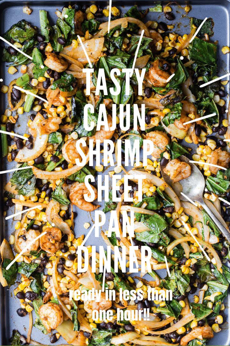 Tasty Cajun shrimp dinner | A super tasty sheet pan dinner for the family, loaded with juicy Cajun Shrimp, black beans, onions, corn, and collard greens! No mess and no fuss, this is a winner! #onepan #sheetpanrecipe #cajunshrimp