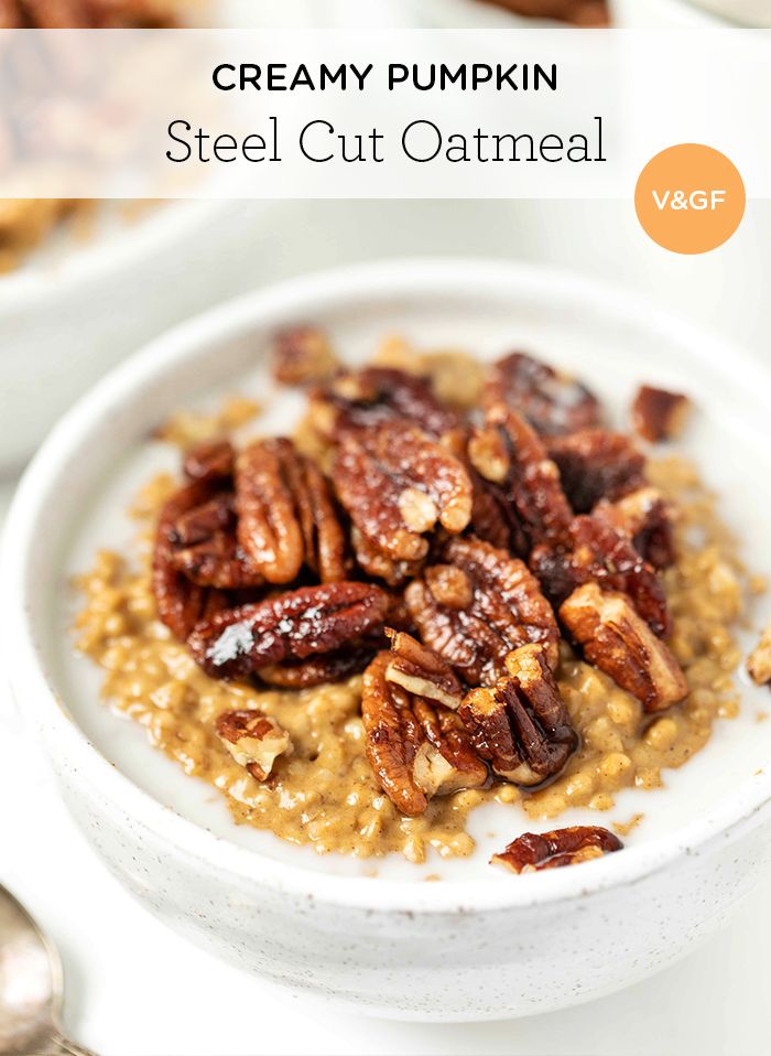 Pumpkin Steel Cut Oatmeal — made in just one pot, with healthy ingredients! Vegan, high fiber and sweetened with coconut sugar! Simply Quinoa #steelcutoats #pumpkinspice #pumpkinoatmeal #pumpkinoats #pumpkinbreakfast #veganbreakfast #simplyquinoa #onepotmeal