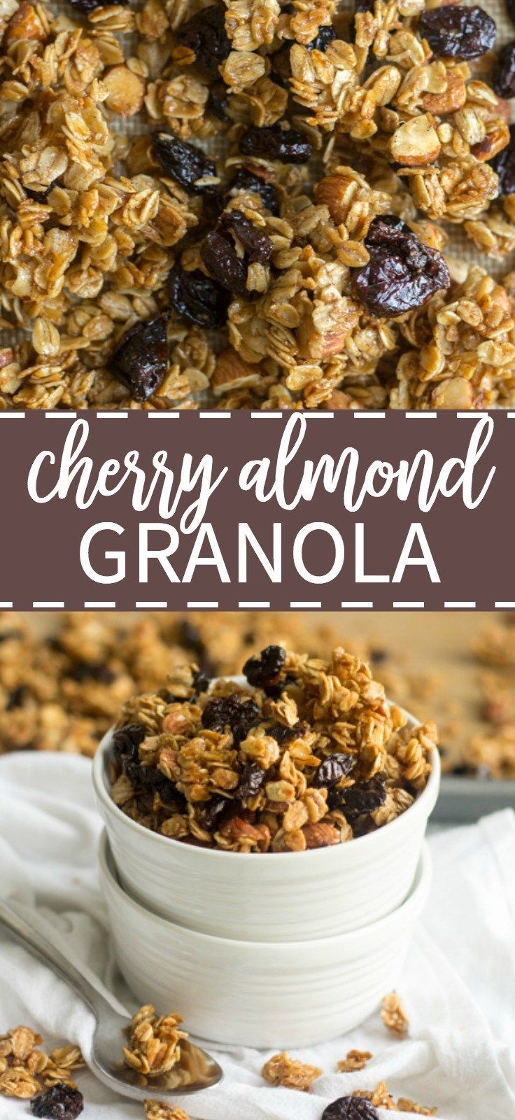 Crunchy, sticky and sweet, this homemade cherry almond granola is made in one bowl and has so much flavor. Sweetened with mostly maple syrup, this healthy breakfast or snack recipe is so easy to make. Mix all 8 ingredients in a bowl and spread it on the pan and bake for 45 mins.