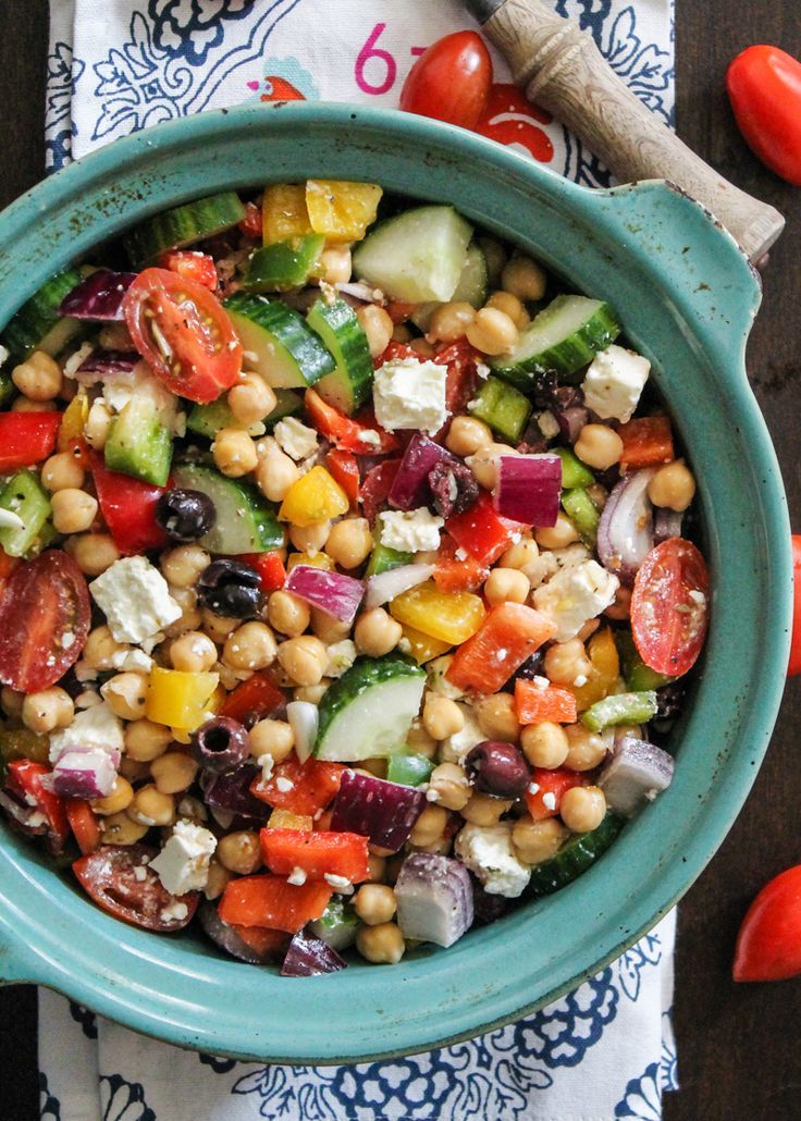 Healthy Recipes : Easy chickpea greek salad with olives, feta, tomatoes, onion, garlic and a light…