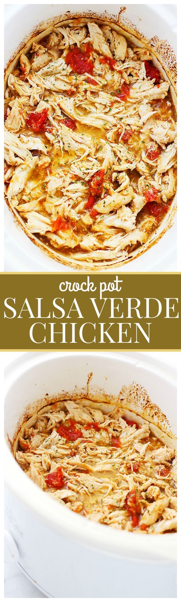 Easy Crock Pot Salsa Verde Chicken – Loaded with salsa verde and delicious chopped tomatoes, this healthy crock pot chicken is incredibly flavorful and extremely easy to make. Just place it all in the crock pot and walk away. #chickenrecipes #slowcooker #crockpot #dinnerrecipes #partyfood #gamedayfood #tacos