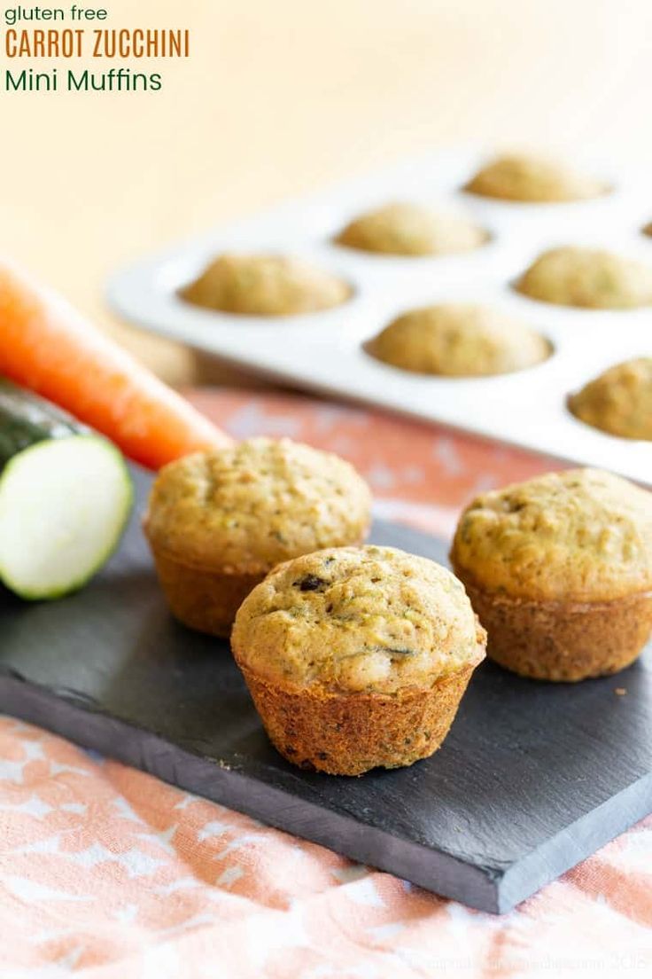 Gluten Free Carrot Zucchini Mini Muffins – an easy, healthy muffin recipe that’s wheat free. Kids love these bite-sized snacks, and moms love that they are sweetened with only a little maple syrup and packed with vegetables. #cupcakesandkalechips #glutenfree #nutfree #zucchini #afterschoolsnack #breakfast #kidssnack #glutenfreemuffins
