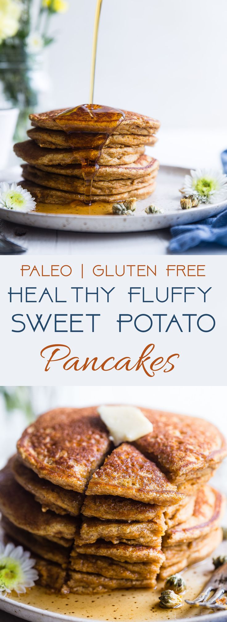 Gluten Free Paleo Sweet Potato Pancakes – SO fluffy and tender that you won’t believe they’re made without butter or oil! Perfect for a healthy breakfast and freezes great for busy mornings! | #Foodfaithfitness | #Glutenfree #Paleo #Healthy #Dairyfree #Pancakes