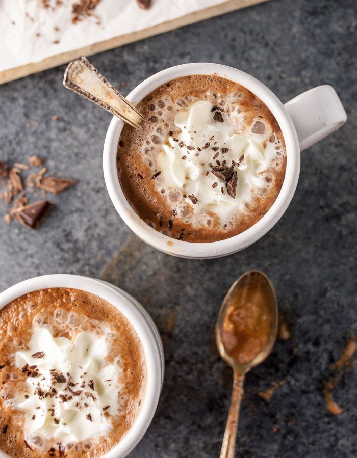 Healthy Dairy Free Hot Chocolate. This hot chocolate is made with almond milk, raw cacao powder, pure maple syrup, and vanilla for a quick and easy treat that is naturally sweetened, vegan, and paleo friendly. It’s the perfect dessert in the evening! #hotchocolate #chocolate