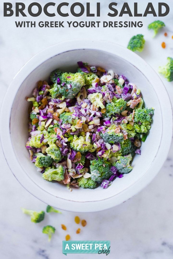 Healthy Broccoli Salad with Greek Yogurt Dressing | This Healthy Broccoli Salad with Greek Yogurt Dressing is a healthy and delicious side salad that makes an amazing side dish for holidays and BBQs | A Sweet Pea Chef #broccolisalad #greekyogurtdressing #sidedish #cleaneating #asweetpeachef