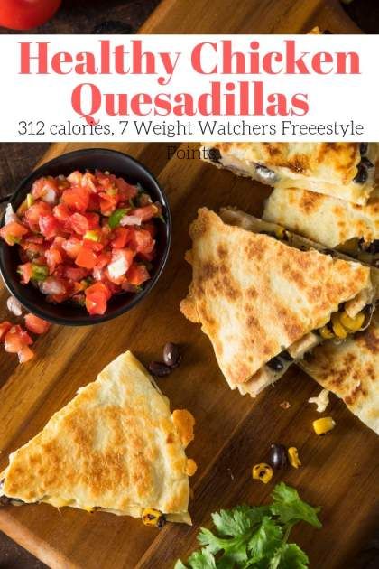 These Healthy Chicken Quesadillas come together in less than twenty minutes and are filled with good for you ingredients like chicken, beans, corn, and tomatoes. With 300 calories and 27 grams of protein, this quesadilla will keep you full all day. | Slender Kitchen | Weight Watchers | Lunch | Dinner | Chicken | #slenderkitchen #weightwatchers #healthyrecipes #dinner #lunch #chicken #quesadillas