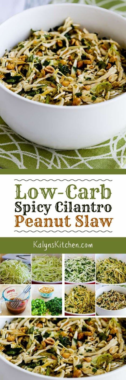 I love cabbage salads, and I could eat this amazing Low-Carb Spicy Cilantro-Peanut Slaw once a week and I’d never get tired of it. And this tasty salad is low-carb, Keto, low-glycemic, gluten-free, dairy-free, vegan, and South Beach Diet friendly. Use more thinly sliced green onion if you’re not a cilantro fan! [found on KalynsKitchen.com]