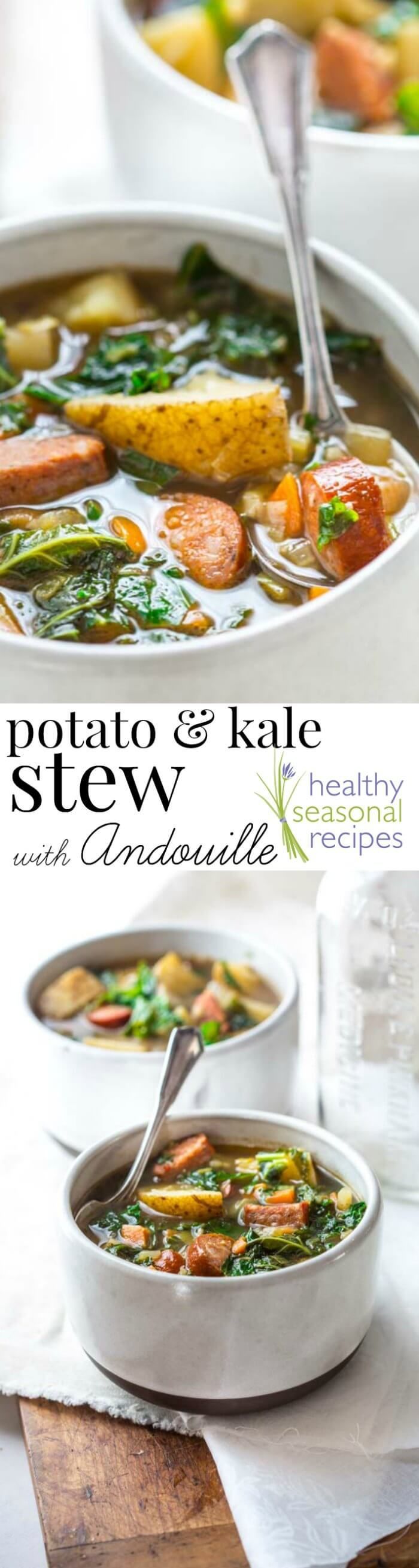 If you're looking for a yummy but healthy Potato and Sausage Soup then, you'll love this Potato and Kale Soup with Andouille Sausage! It's naturally gluten-free, ready in 45 minutes and only 260 calories per serving! Healthy Seasonal Recipes by Katie Webster