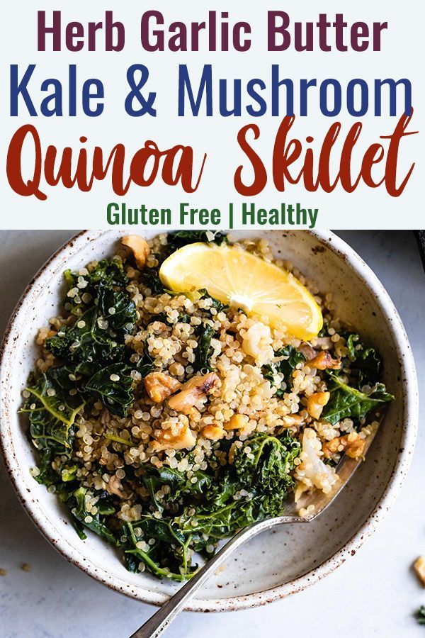Kale Quinoa and Mushroom Skillet with Garlic Herb Butter – This skillet is made in one pan and is SO easy and full of flavour. It’s a healthy, meatless dinner that your whole family will love! Great for meal prep too! | #Foodfaithfitness | #Glutenfree #Vegetarian