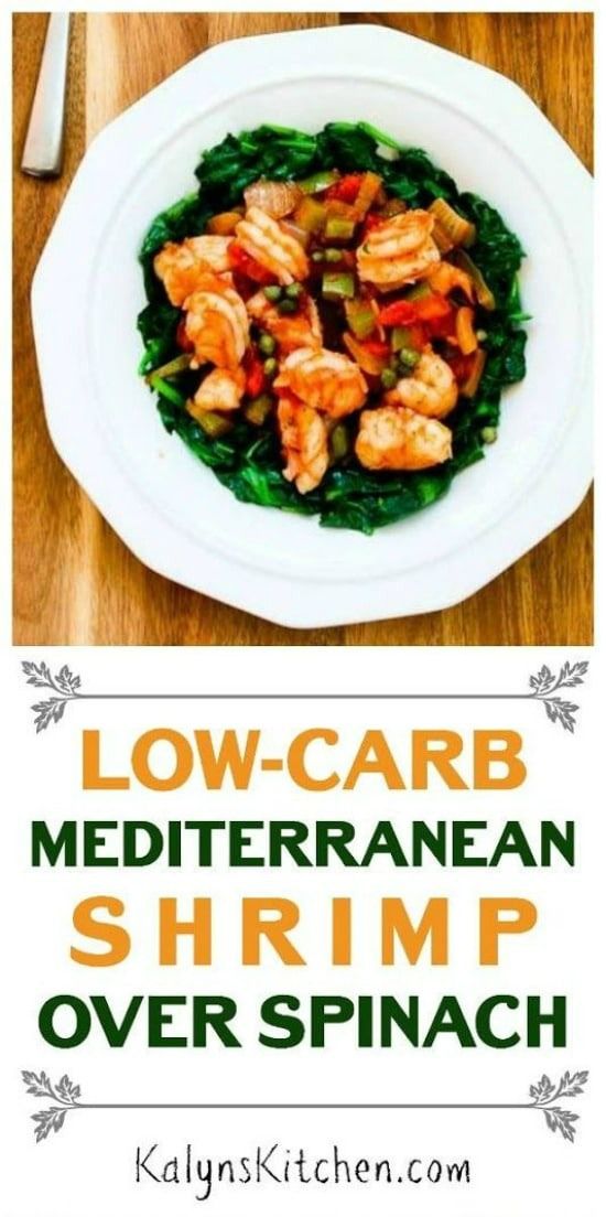 Low-Carb Mediterranean Shrimp over Spinach is a quick and easy dinner that’s also Keto, low-glcemic, gluten-free, Paleo, Whole 30, dairy-free, and South Beach Diet friendly. But more important, it’s delicious! [found on KalynsKitchen.com] #KalynsKitchen #LowCarbShrimp #MediterraneanShrimp #LowCarbShrimpSpinach #LowCarbShrimpDinner