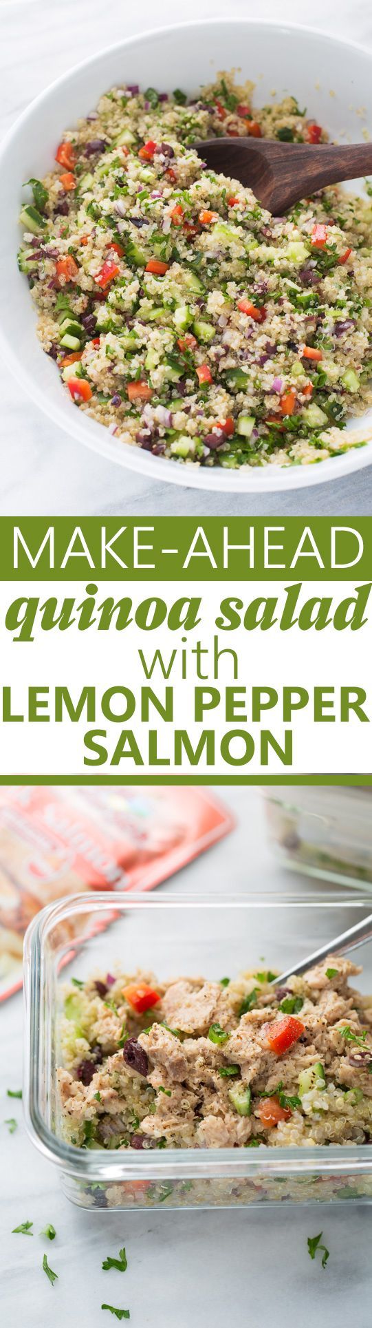 Make-Ahead Quinoa Salad with Lemon Pepper Salmon! An easy, meal-prep lunch that is full of veggies and healthy fats. (Gluten-Free, Dairy-Free) #glutenfree #gflunch #salmon #quinoasalad #mealprep #meaningfuleats