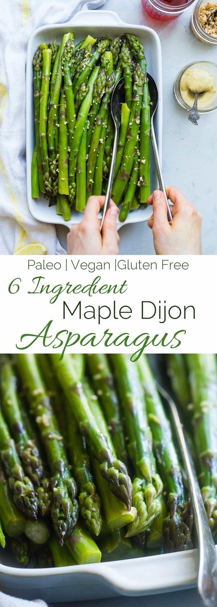 Maple Dijon Asparagus -Â This quick and easy, gluten free blanched asparagus recipe is a healthy, vegan and paleo friendly side dish that the whole family will love! Only 60 calories and 2 SmartPoints too! | Foodfaithfitness.com | Taylor | Food Faith Fitness – Healthy Gluten Free Recipes & Fitness Tips