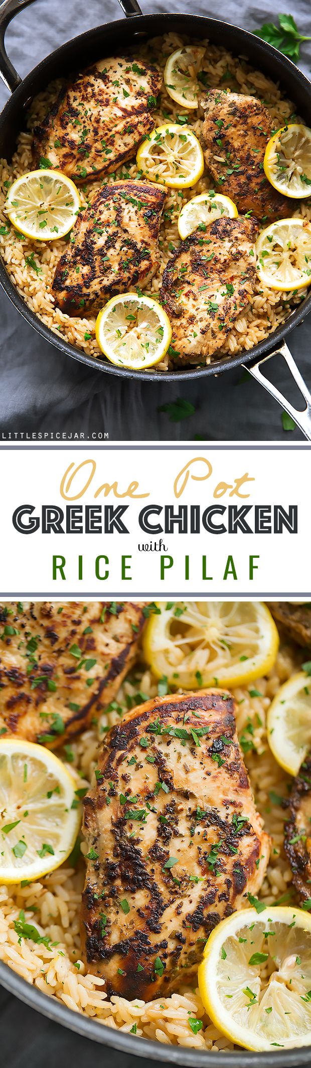 One Pot Greek Chicken and Rice Pilaf – a simple one pot dinner that’s ready in 45 minutes and tastes lemon/herby fresh! #ricepilaf #onepotmeals #onepanmeals #skilletchicken #chickendinner | Littlespicejar.com