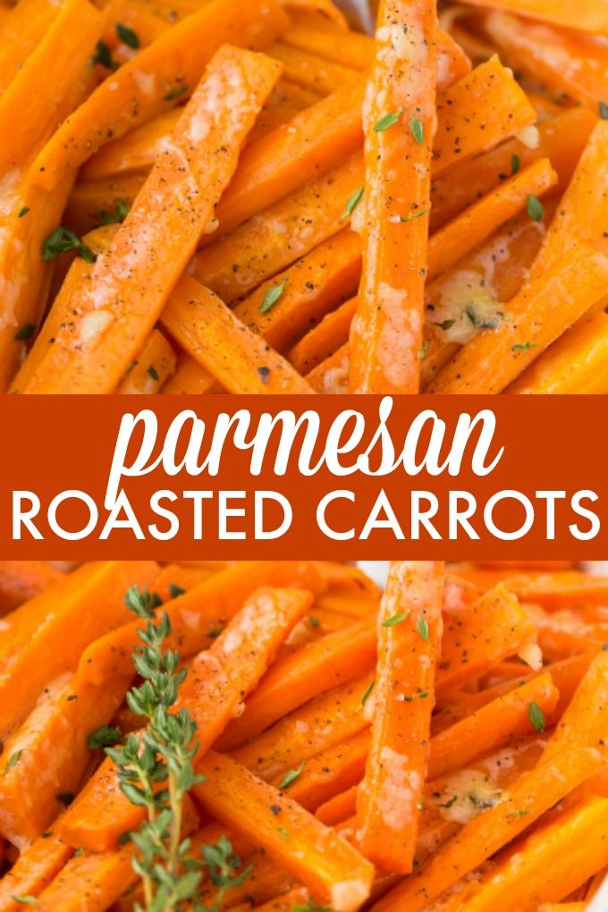 Parmesan Roasted Carrots – Tender and perfectly roasted carrots topped with fresh thyme and melted Parmesan cheese. So tasty!