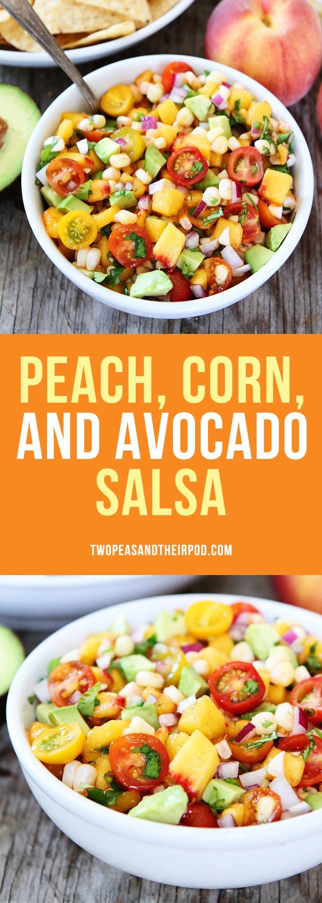 Peach, Corn, and Avocado Salsa This fresh and simple salsa is perfect for summertime! It is great served with tortilla chips, pita chips, or with grilled chicken, fish, or pork! It is summer in a bowl!
