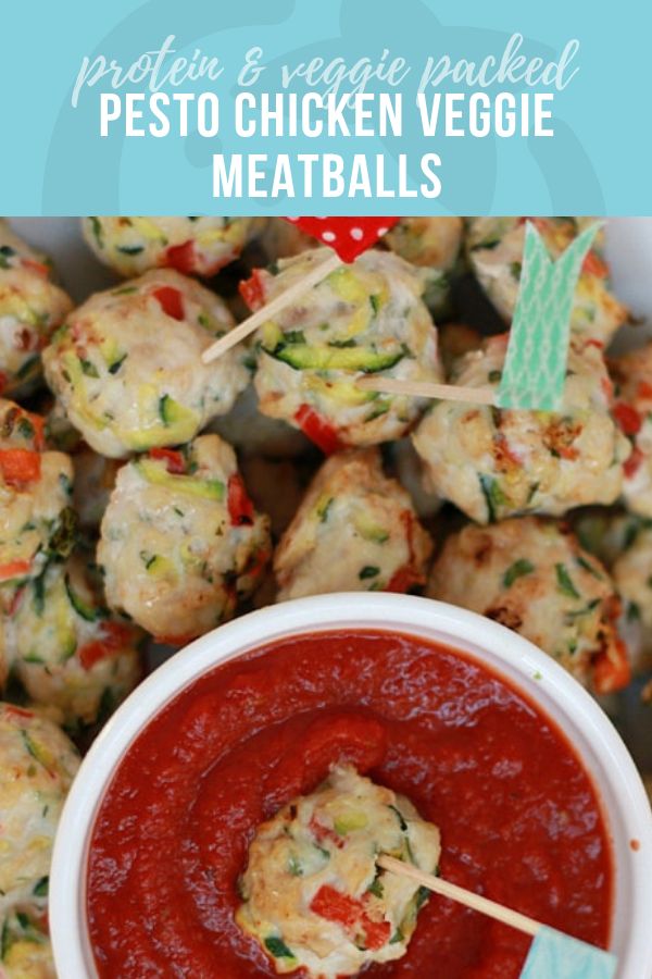 Pesto Chicken Veggie Meatballs | Healthy Ideas & Recipes for Kids You can certainly serve these atop a steaming pile of pasta (any shape will do) and smothered in your favorite sauce (Alfredo, marinara, pesto–it all works). Our favorite way is to serve them with toothpicks and a dollop of your favorite pizza sauce on the side. This allows our toddlers to explore the new flavors at their own pace.