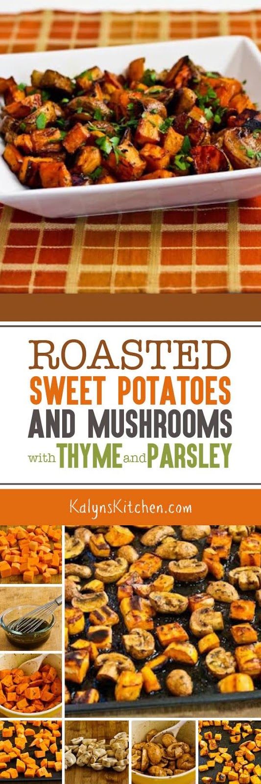 Roasted Sweet Potatoes get a little bit fancier with Mushrooms and Thyme, and this tasty side dish is low-glycemic, gluten-free, dairy-free, Paleo, Whole 30, and South Beach Diet friendly. And roasted sweet potatoes are so, so, so good! [found on KalynsKitchen.com] #KalynsKitchen #RoastedSweetPotatoesMushroomsThyme #SweetPotatoes #RoastedSweetPotatoes #ThanksgivingSideDish #Paleo #GlutenFree #LowGlycemic