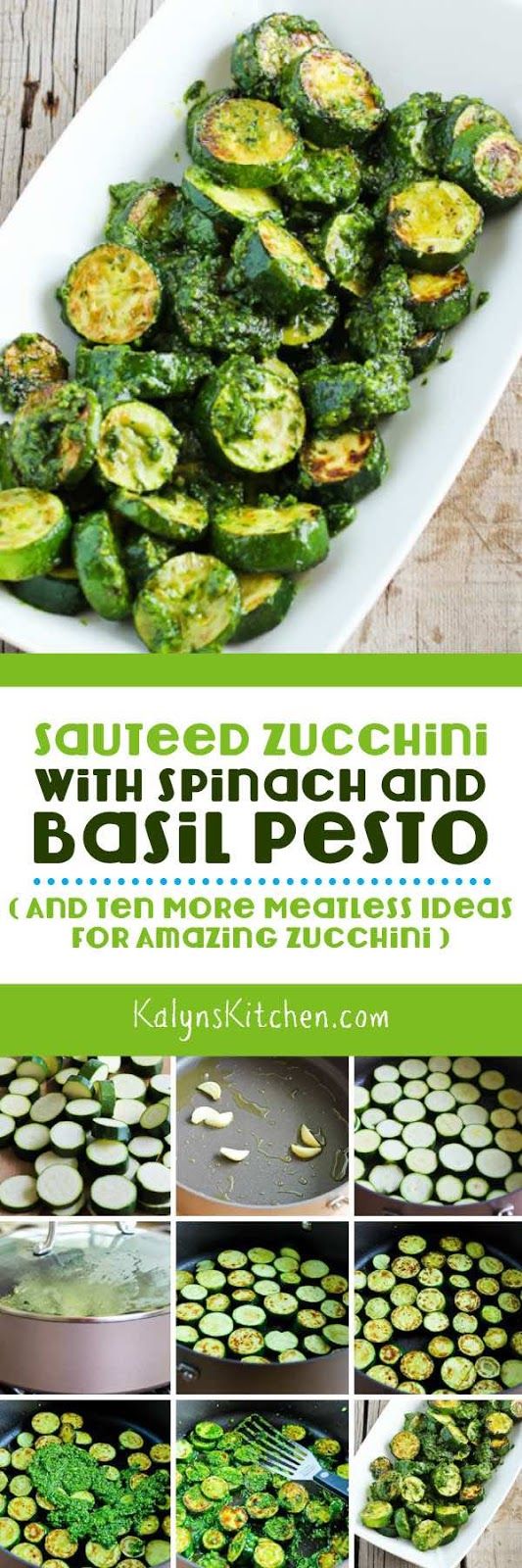 Sauteed Zucchini with Spinach and Basil Pesto (And Ten More Meatless Ideas for Amazing Zucchini). Zucchini like this is such a great idea for a low-carb side dish! [found on KalynsKitchen.com]