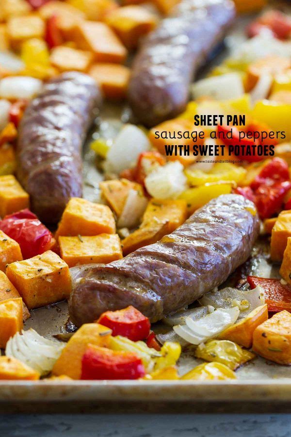 So simple, yet so flavorful, this Sheet Pan Sausage and Peppers with Sweet Potatoes is a dinner favorite! Everything roasts together on one sheet pan, which makes clean up a breeze, too! #dinnerrecipes #recipes #sausage #peppers #sweetpotaotes