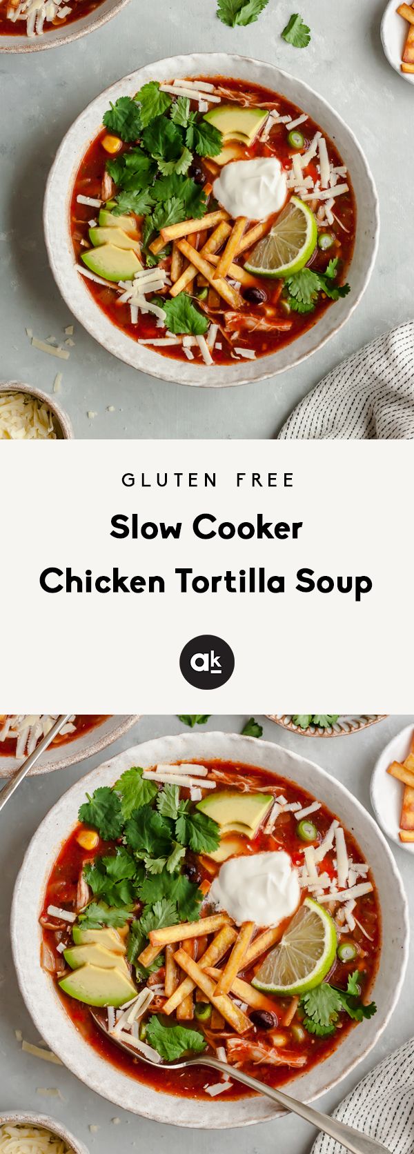 The best healthy Slow Cooker Chicken Tortilla Soup recipe loaded with fire-roasted tomatoes, tender chicken and savory spices. This easy recipe is perfect for meal prep or family dinner and can easily be made on the stovetop too. Top with avocado, cheese, sour cream and crispy tortilla chips! #slowcookerrecipes #slowcookermeals