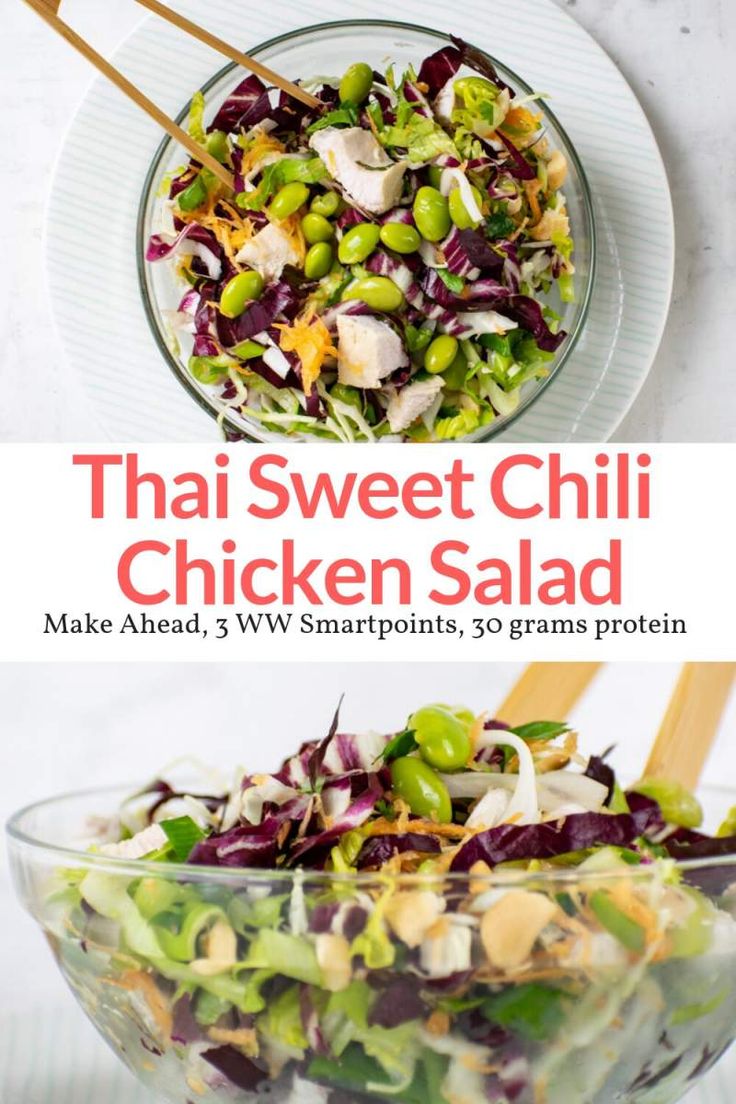 Sweet Chili Chicken Salad made with the best peanut dressing is full of flavor and packed with crunch from purple cabbage, carrots, and edamame. This Slender Kitchen salad is 3 Weight Watchers Smartpoints. #healthyrecipes #salad #kidfriendly